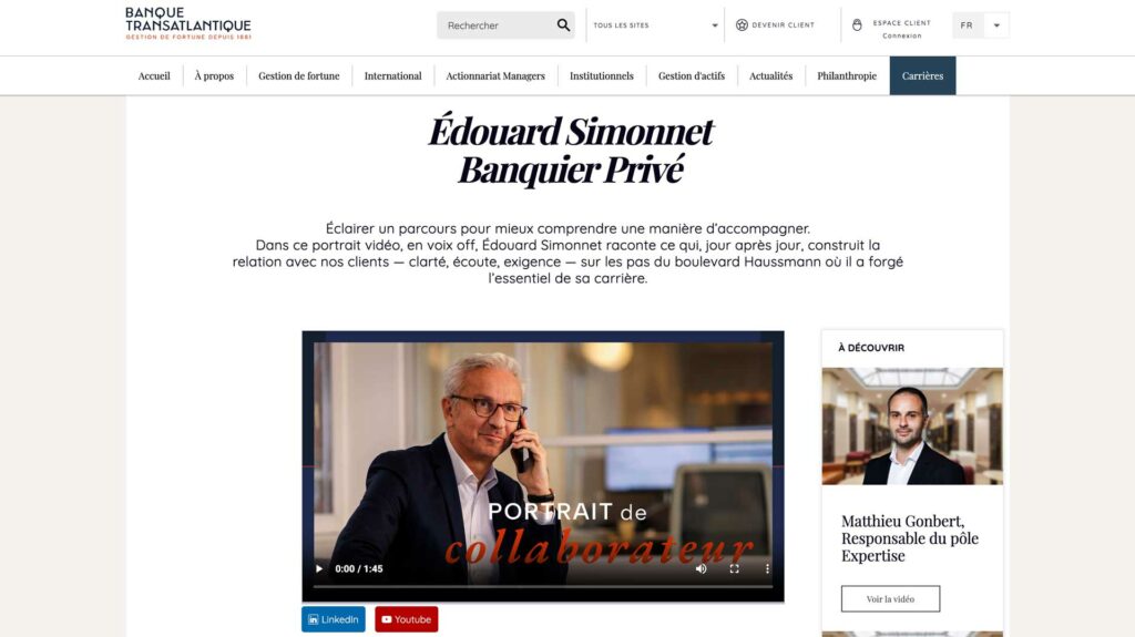 Cette série de portraits vidéo marque employeur est devenue un outil stratégique au service de la communication RH de la Banque Transatlantique.